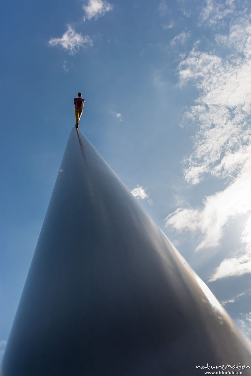 Skulptur "Man walking to the sky" von Jonathan Borofsky am Hauptbahnhof Kassel, blauer Himmel, Kassel, Deutschland