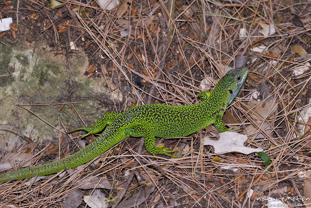 Smaragdeidechse, Lacerta viridis, Lacerta bilineata, Lacertidae, versteckt im Unterholz, Campingplatz Baldarin, Cres, Kroatien