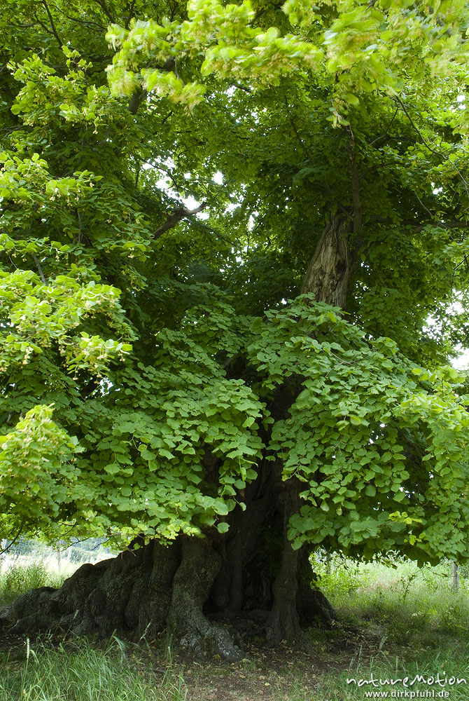 Sommer-Linde, Tilia platyphyllos, Malvengewächse (Malvaceae), ca. 700 Jahre alt, einzeln stehend am , Speck, Deutschland