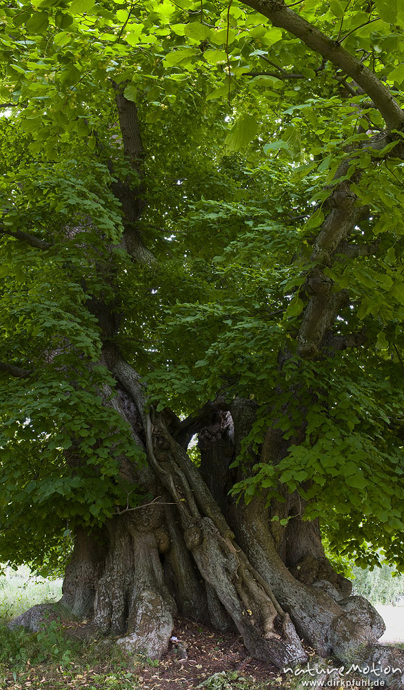 Sommer-Linde, Tilia platyphyllos, Malvengewächse (Malvaceae), ca. 700 Jahre alt, einzeln stehend am Ortsrand, Stamm, Wurzelbereich, Laub, vertikales Panorama aus 3 Einzelbildern, Speck, Deutschland