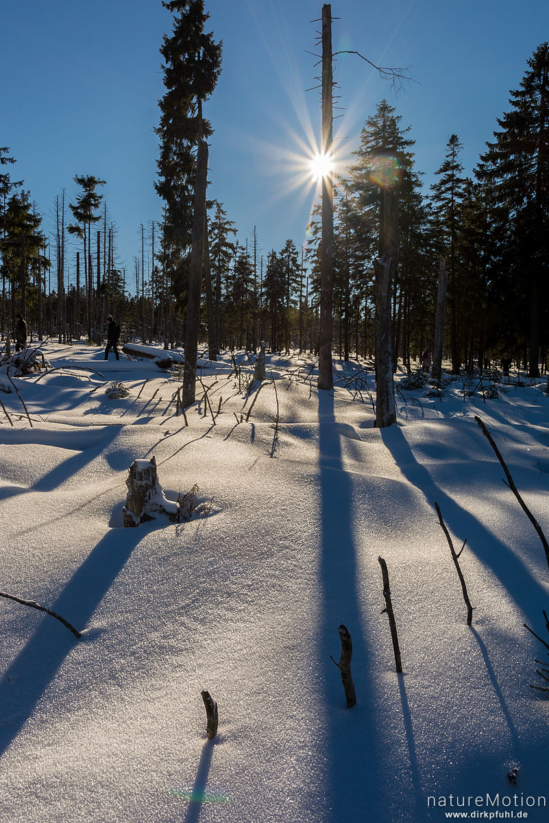 Sonne strahlt durch abgestorbene Fichten, Schnee, Schatten, Torfhaus, Deutschland