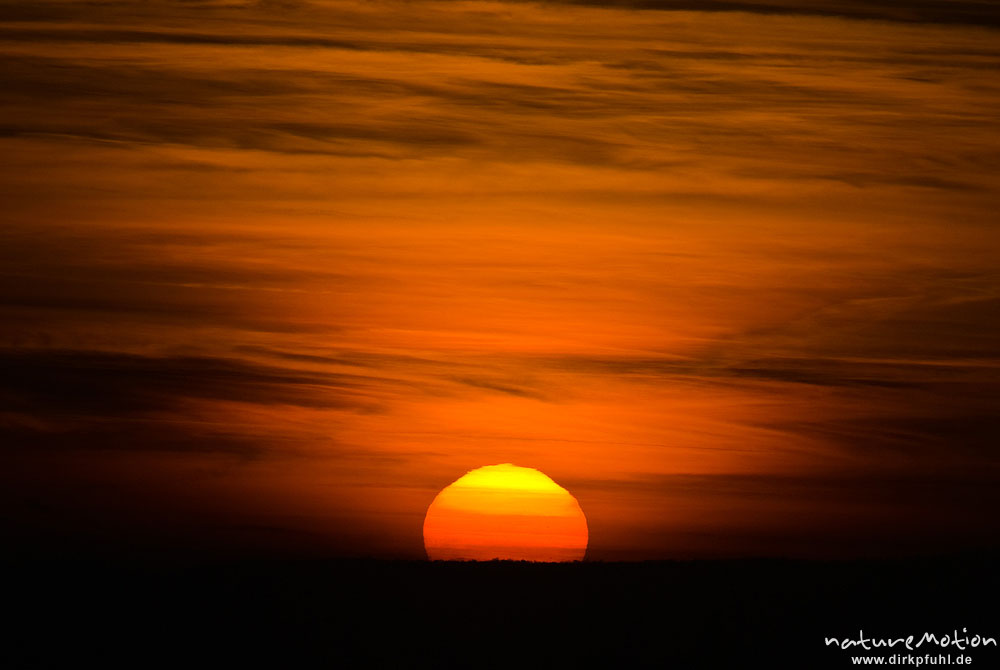 Sonne versinkt als rote Scheibe hinter dem Horizont, roter Himmel, Göttingen, Deutschland