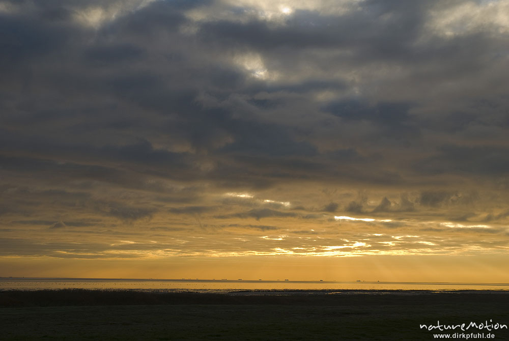Sonnenaufgang über dem Watt, Wolken, Lichtstrahlen, am Horizont Kette von Halligen: Langeneß, Hooge, Amrum, Deutschland