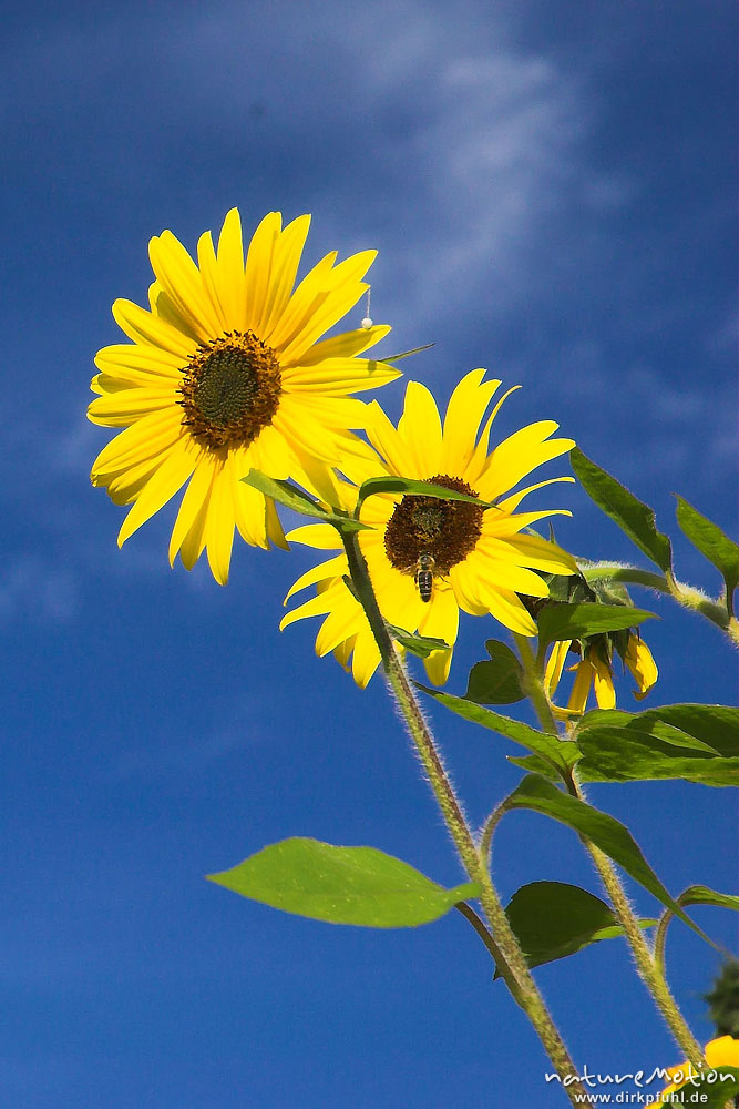 Sonnenblume, Helianthus annuus, Blüten vor blauem Himmel mit Zirrus-Wolken Hoher Meißner, Deutschland