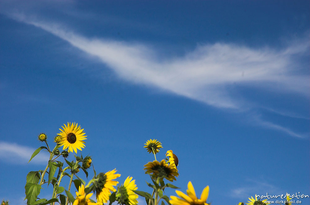 Sonnenblume, Helianthus annuus, Blüten vor blauem Himmel mit Zirrus-Wolken, Hoher Meißner, Deutschland