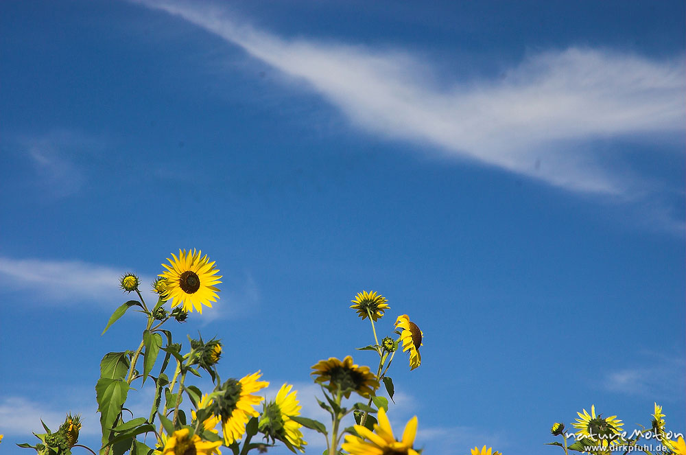 Sonnenblume, Helianthus annuus, Blüten vor blauem Himmel mit Zirrus-Wolken, Hoher Meißner, Deutschland