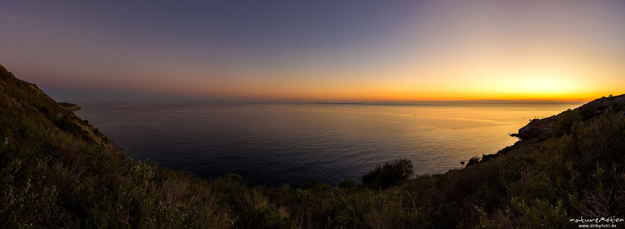 Sonnenuntergang an der Küste bei Fetovaia, im Westen Silhouette von Korsika, Elba, Italien