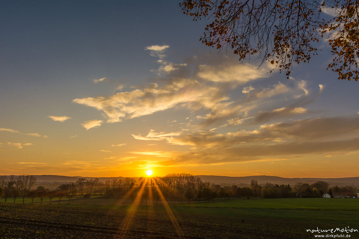 Sonnenuntergang, Felder, Abendlicht, Wolkenzug, Leineauen, Göttingen, Deutschland