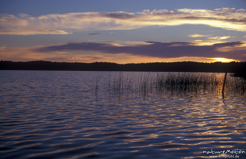 Sonnenuntergang über dem Gobenowsee, Wolken, Binsen, Wasserspiegelung, Mecklenburger Seen, Deutschland
