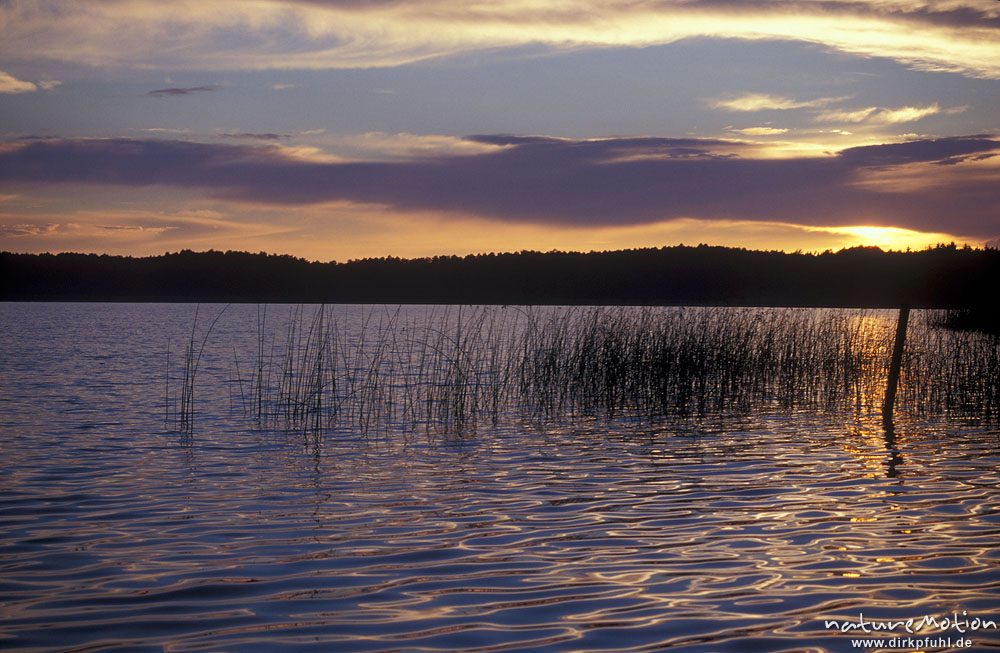Sonnenuntergang über dem Gobenowsee, Wolken, Binsen, Wasserspiegelung, Mecklenburger Seen, Deutschland