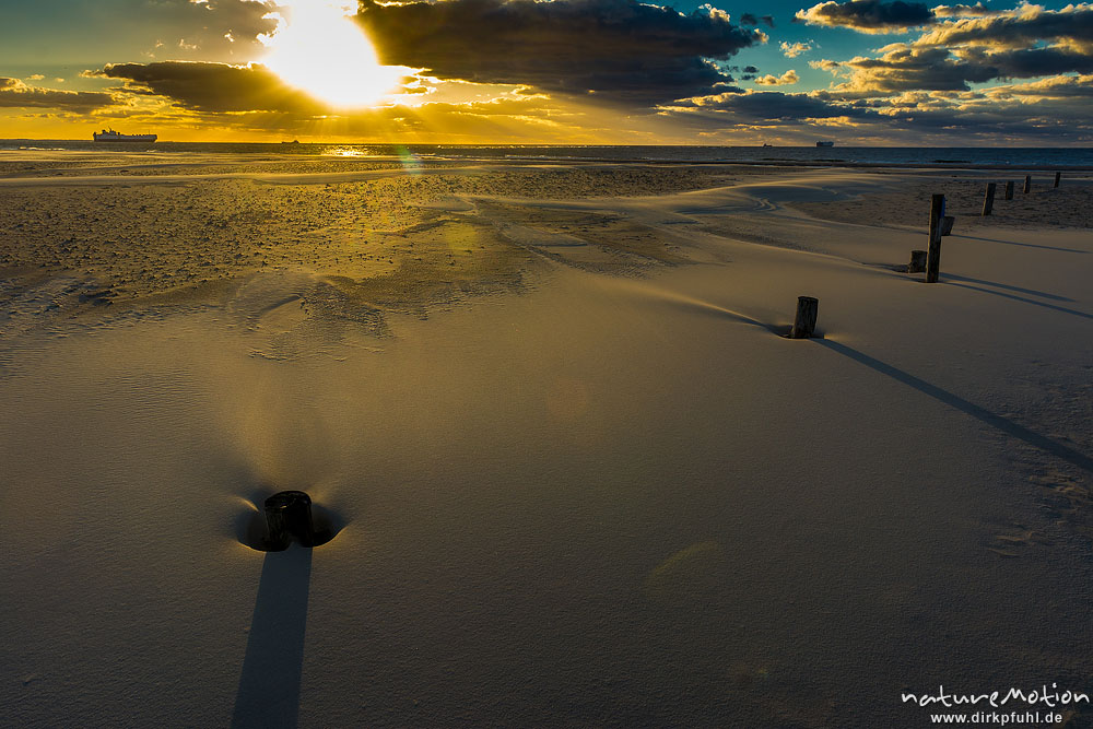 Sonnenuntergang über dem Meer, Abgrenzung Ruhezone Nationalpark, Hohes Riff, Borkum, Deutschland