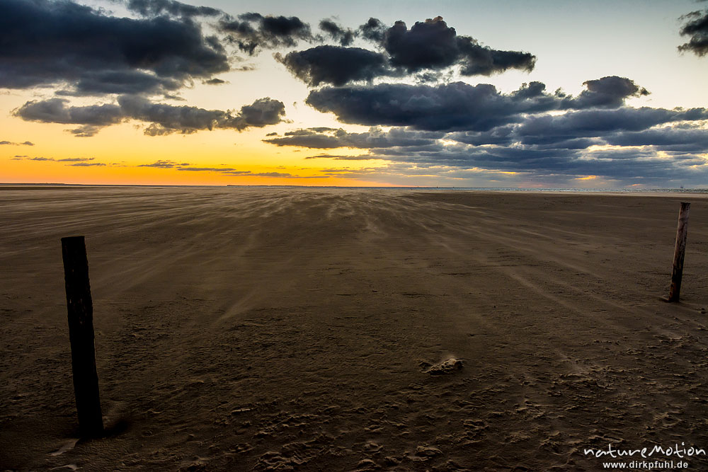 Sonnenuntergang über dem Meer, wehender Sand, Hohes Riff, Borkum, Deutschland