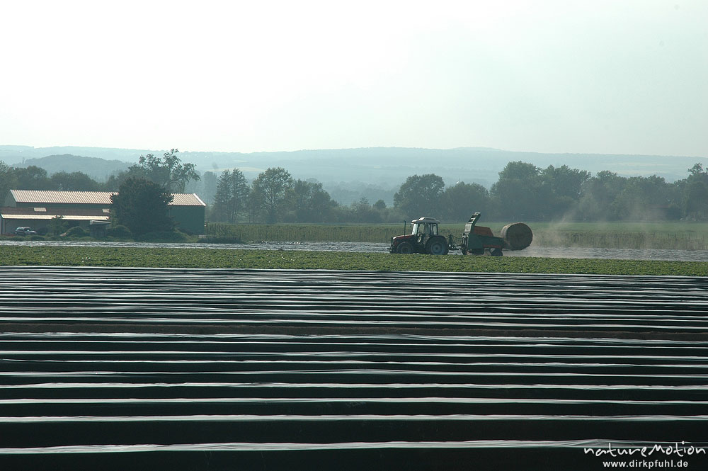 Spargelfeld, Beete mit Folien bedeckt, Trecker, Gartetal Göttingen, Deutschland