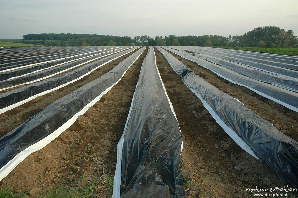Spargelfeld, einzelne Hochbeete mit Folien bedeckt, Gartetal Göttingen, Deutschland