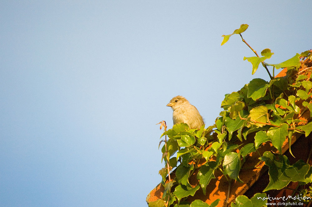 Spatz, Haussperling, Passer domesticus, Passeridae, an Hausfassade mit Weinlaub (darin zahlreiche Schlafplätze), Zahren, Deutschland
