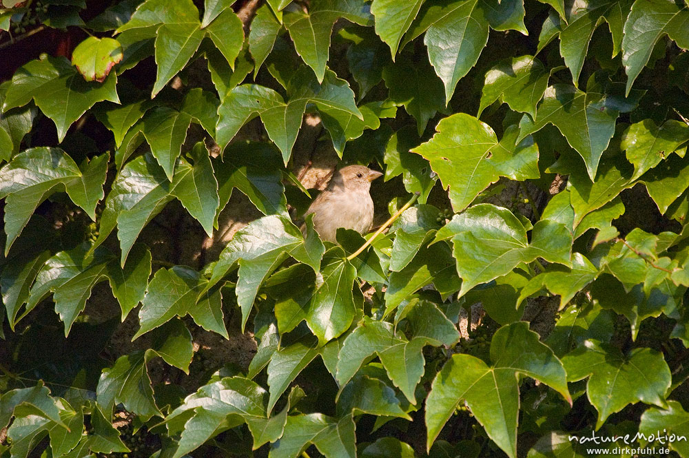 Spatz, Haussperling, Passer domesticus, Passeridae, an Hausfassade mit Weinlaub (darin zahlreiche Schlafplätze), Zahren, Deutschland