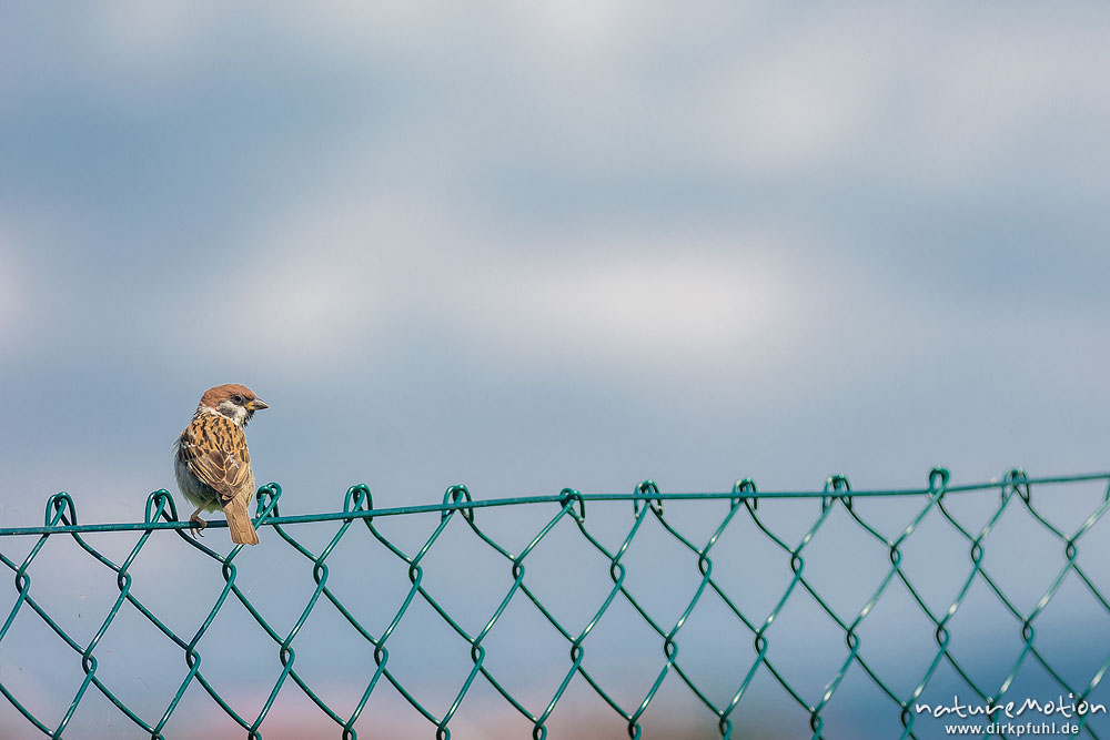 Spatz, Haussperling, Passer domesticus, Passeridae, Tier sitzt auf Zaun, Klärschlammvererdungsanlage, Heringen, Deutschland