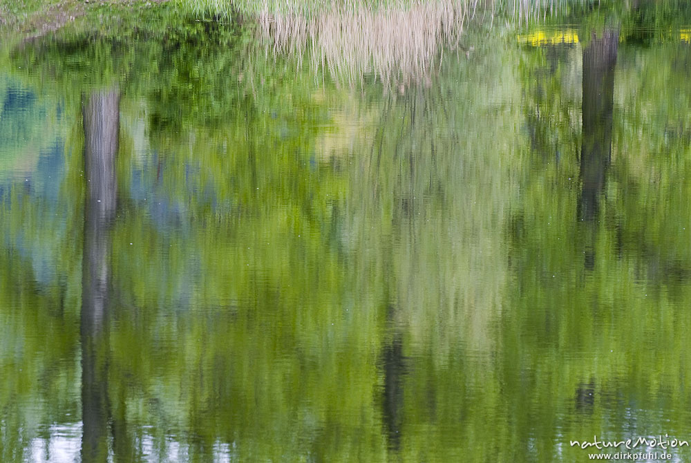Spiegelungen von Bäumen und Schilf auf Wasseroberfläche, Fischteich, Wanfried, Deutschland