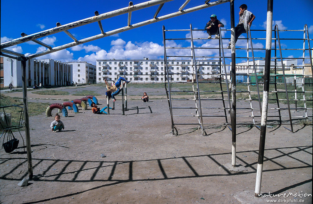 Spielplatz mit verbogenem Kletterger?st hinter Plattenbauten, turnende Kinder Ulaanbaatar - Ulan Bator, Mongolei