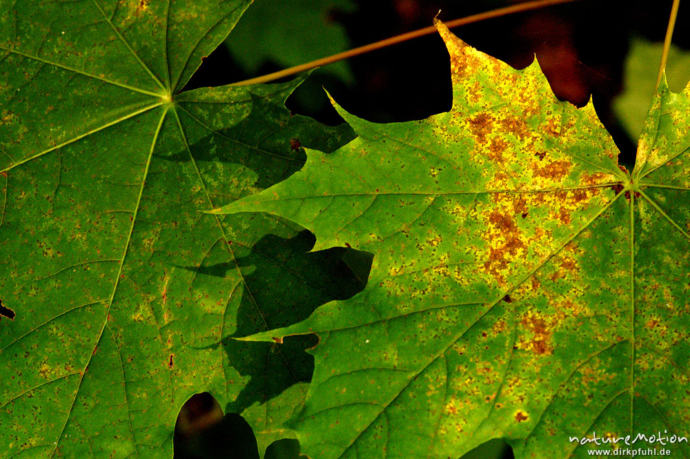 Spitz-Ahorn, Acer platanoides, Aceraceae, Blatt mit beginnender Herbstfärbung, Farbmuster, schöne Zeichnung der Blattadern, Göttinger Wald, Göttingen, Deutschland