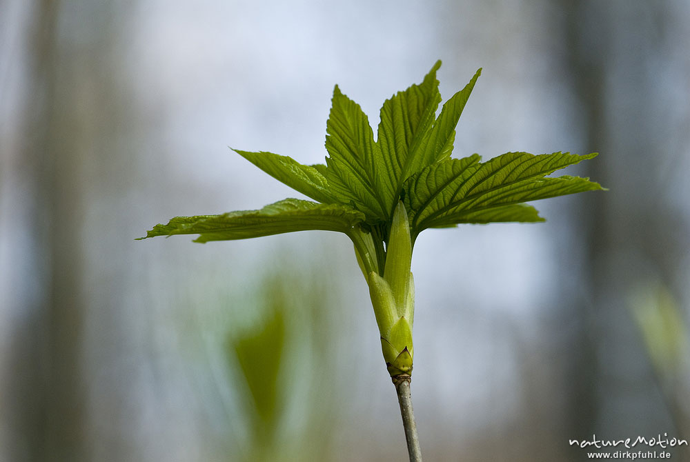Spitz-Ahorn, Acer platanoides, Aceraceae, frisch austreibende Blätter, Blattknospen, Göttinger Wald, Göttingen, Deutschland