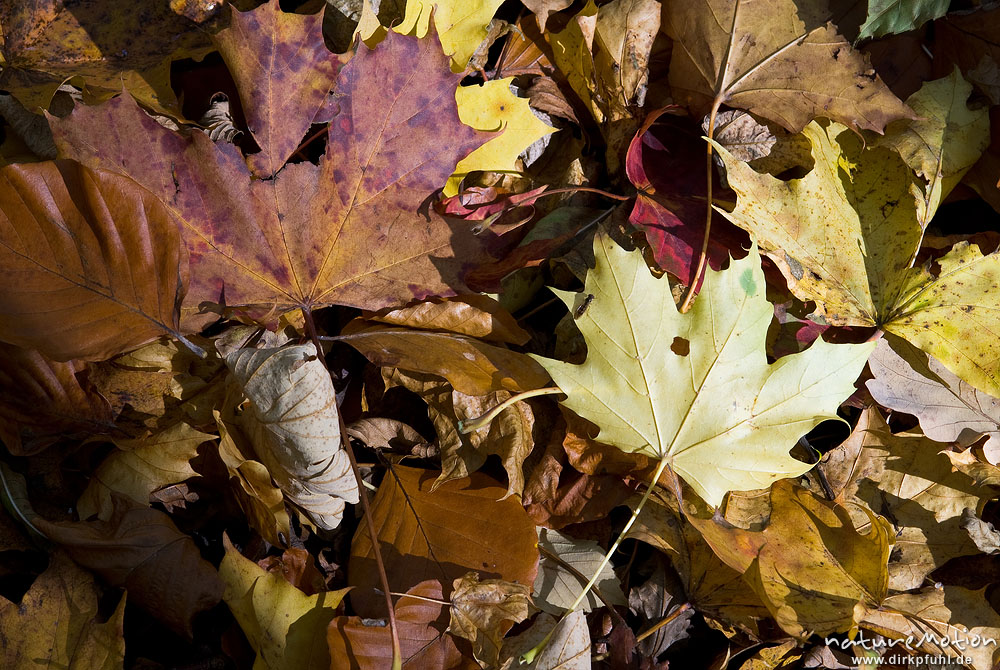 Spitz-Ahorn, Acer platanoides, Aceraceae, Herbstlaub auf Waldboden Göttingen, Deutschland