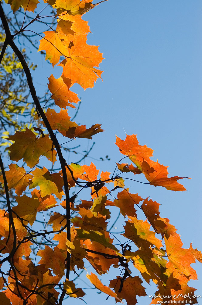 Spitz-Ahorn, Acer platanoides, Aceraceae, Laub in Herbstfärbung, Göttingen, Deutschland