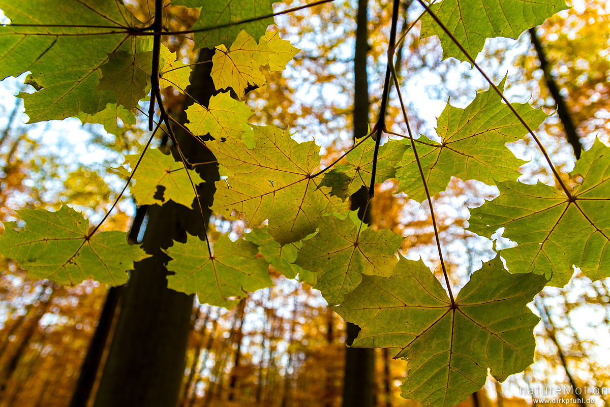 Spitz-Ahorn, Acer platanoides, Aceraceae, Laub mit Herbstfärbung, Kehr, Göttinger Wald, Göttingen, Deutschland