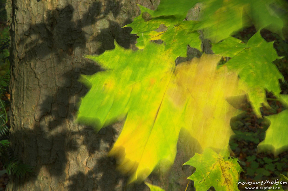 Spitz-Ahorn, Acer platanoides, Blätter mit Herbstfärbung, Schattenwurf, lang belichtet, verwischte Bewegung, Göttinger Wald, Göttingen, Deutschland