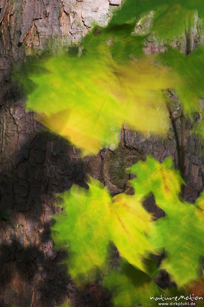 Spitz-Ahorn, Acer platanoides, Blätter mit Herbstfärbung, Schattenwurf, lang belichtet, verwischte Bewegung, Göttinger Wald, Göttingen, Deutschland