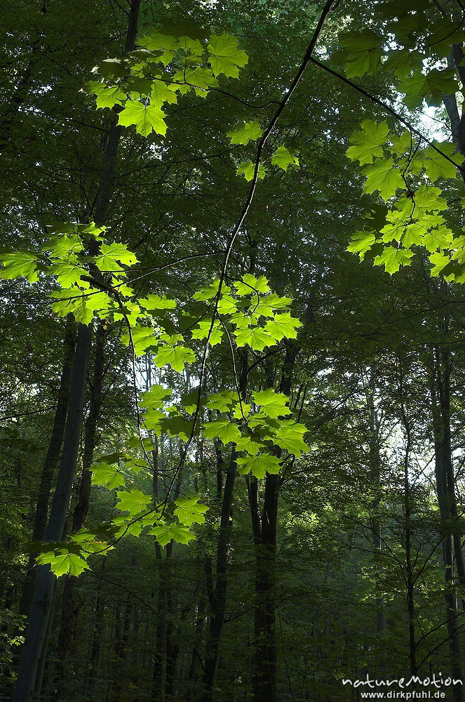 Spitzahorn, Acer platanoides, Blätter im Sonnenlicht, Göttinger Wald, Göttingen, Deutschland