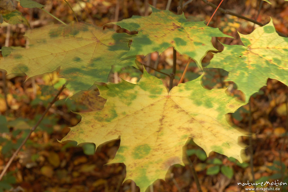 Spitzahorn, Blätter mit Herbstfärbung, lange belichtungszeit, Aufhellblitz, Göttinger Wald, Göttingen, Deutschland