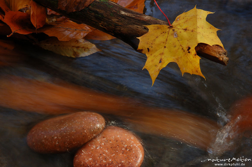 Spitzahornblatt auf Ast über strömendem Wasser, Kiesel, im Wasservorbeitreibende Blätter, Schillerwiese, Göttingen, Göttingen, Deutschland