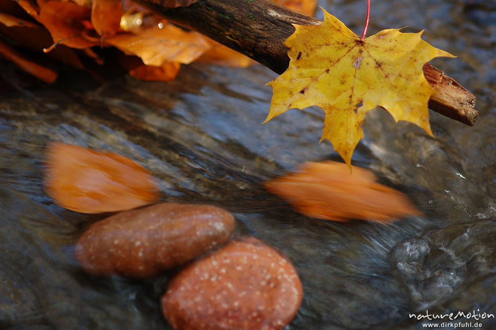 Spitzahornblatt auf Ast über strömendem Wasser, Kiesel, im Wasservorbeitreibende Blätter, Schillerwiese, Göttingen, Göttingen, Deutschland