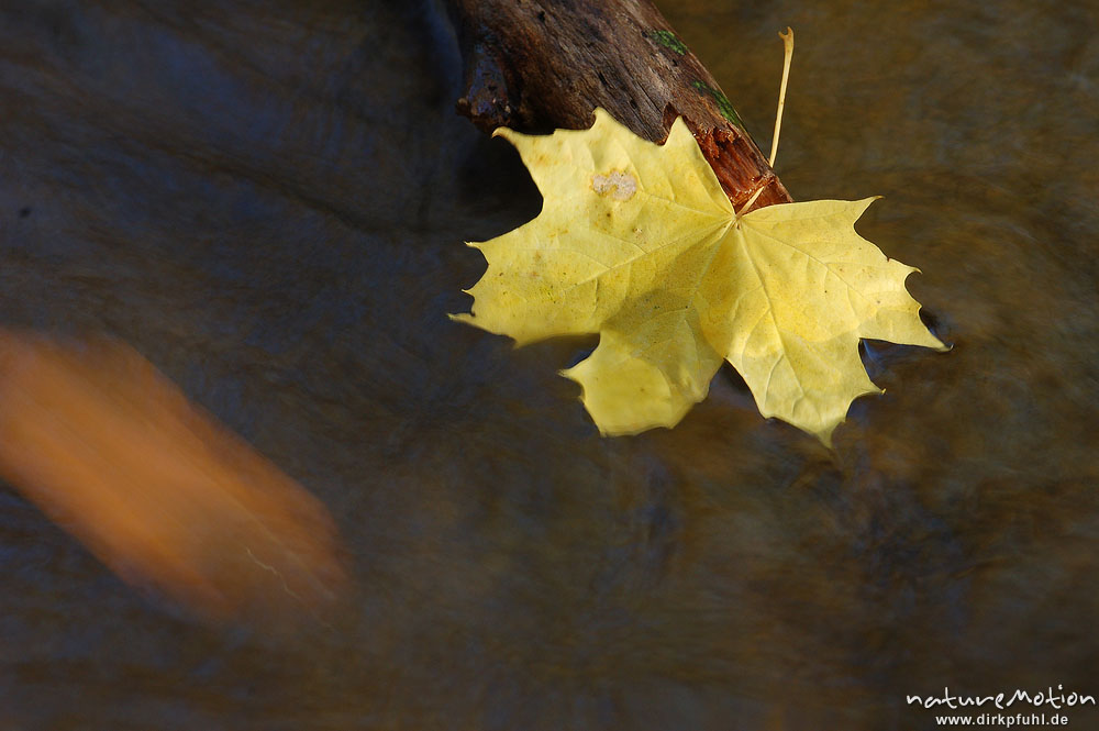 Spitzahornblatt, eingeklemmt in Ast, Bewegung in Strömung eines Baches, vorbeitreibende Blätter Göttingen, Deutschland