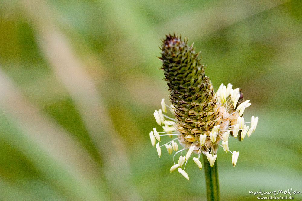 Spitzwegerich, Plantago lanceolata, Plantaginaceae, Blütenstand mit Antheren, Tripkenkuhle Göttingen, Deutschland