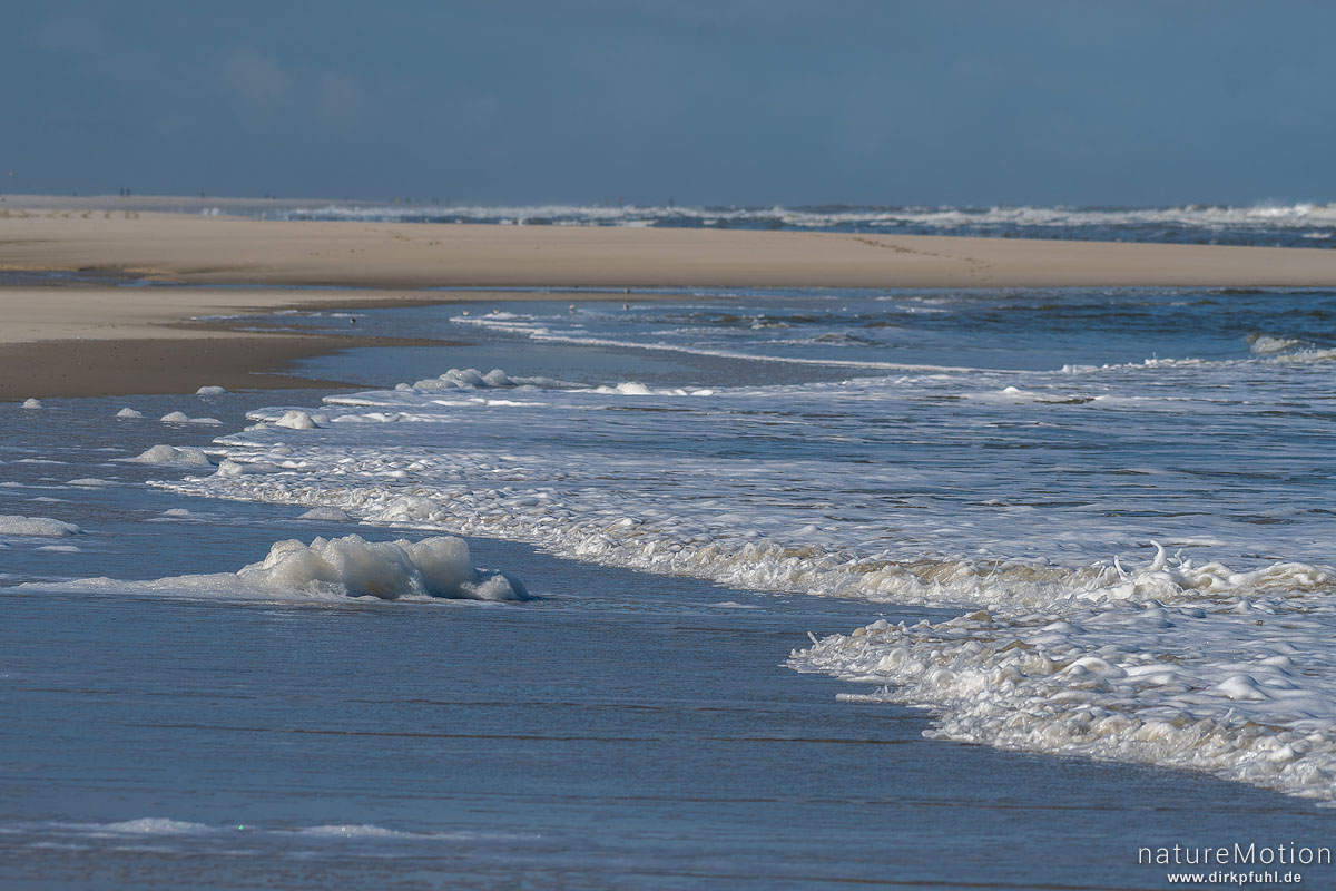 Spülsaum mit auflaufenden Wellen und Meerschaum, Spiekeroog, Deutschland