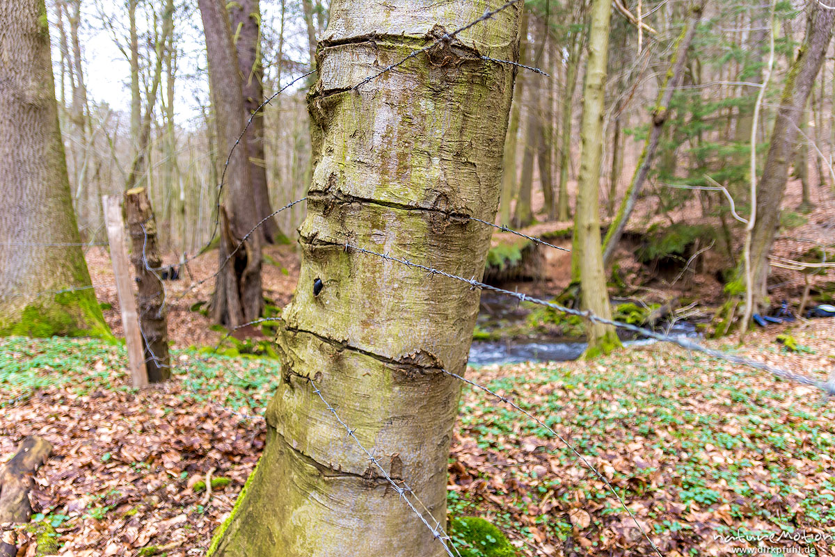 Stacheldrahtzaun, Stacheldraht in Baumstamm eingewachsen, Niemetal, Löwenhagen, Deutschland