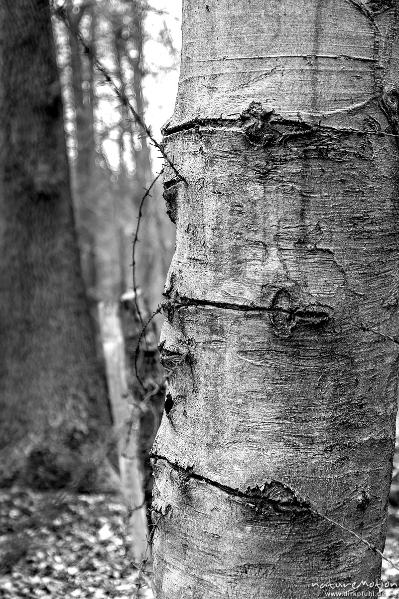 Stacheldrahtzaun, Stacheldraht in Baumstamm eingewachsen, Niemetal, Löwenhagen, Deutschland