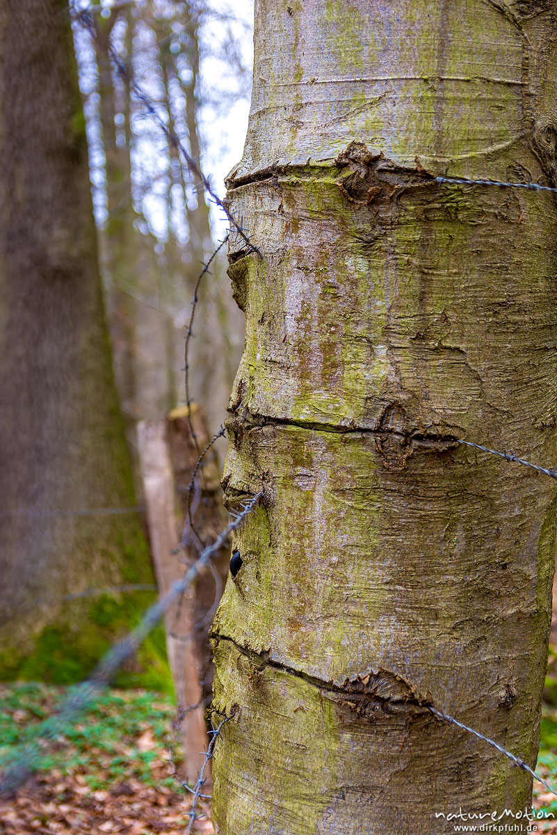 Stacheldrahtzaun, Stacheldraht in Baumstamm eingewachsen, Niemetal, Löwenhagen, Deutschland