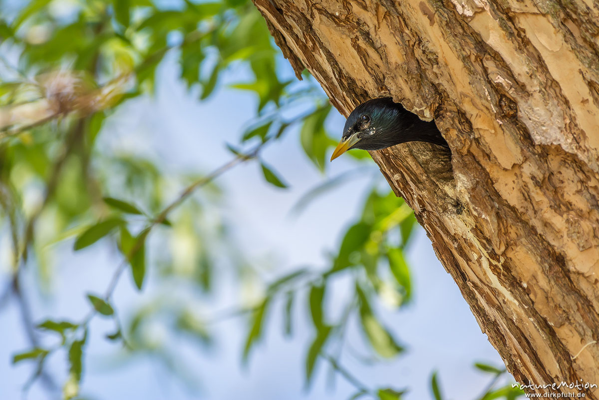 Star, Sturnus vulgaris, Sturnidae, Alttier schaut aus Nisthöhle, Kiessee, Göttingen, Deutschland