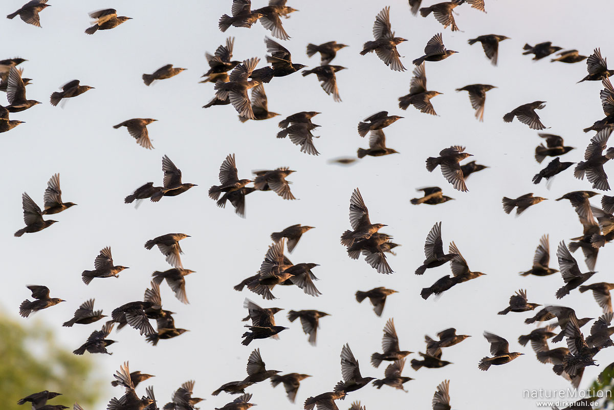 Star, Sturnus vulgaris, Sturnidae, dichter Schwarm, mehrere Tausend Tiere versammeln sich am Schlafp, Göttingen, Deutschland