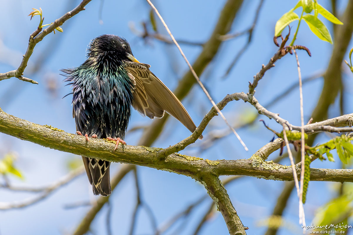 Star, Sturnus vulgaris, Sturnidae, Tier auf Ast nahe Nisthöhle, Gefiederpflege, Kiessee, Göttingen, Deutschland
