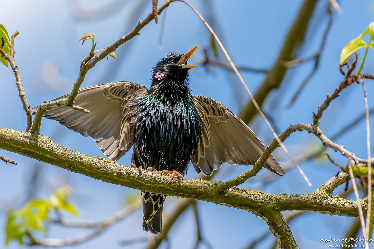 Star, Sturnus vulgaris, Sturnidae, Tier auf Ast nahe Nisthöhle, Gesang, Kiessee, Göttingen, Deutschland