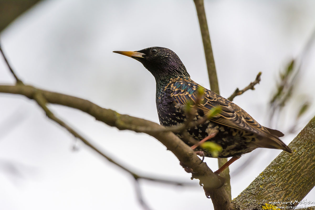 Star, Sturnus vulgaris, Sturnidae, Tier auf Ast neben von Specht gebauter Bruthöhle, Levinscher Park, Göttingen, Deutschland