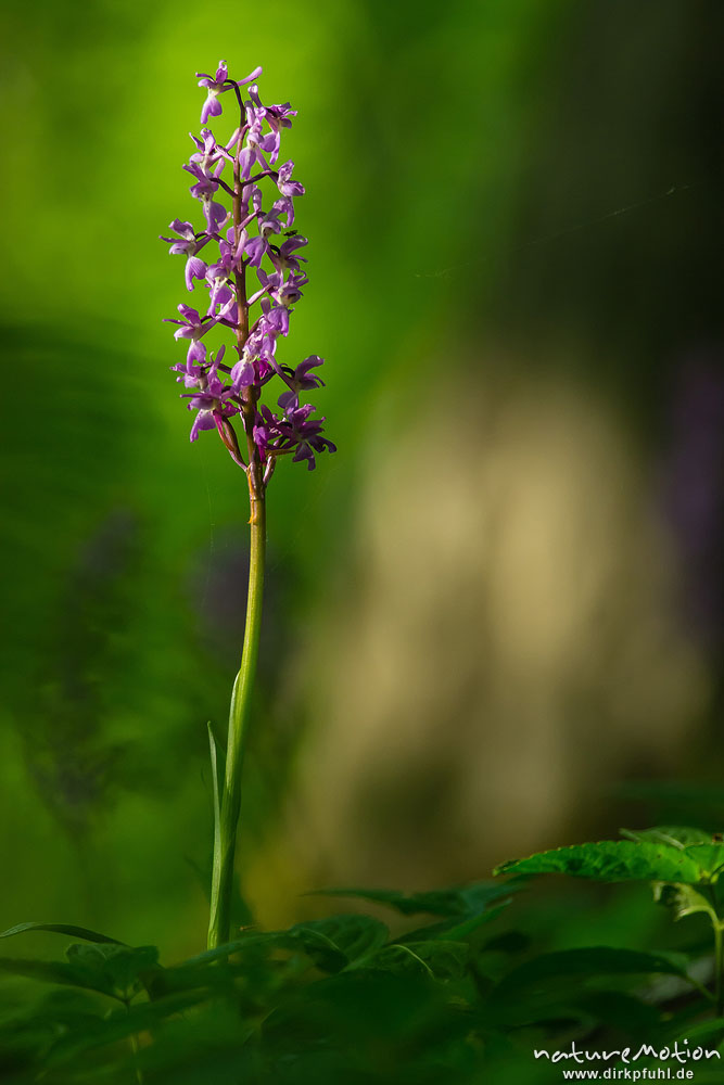 Stattliches Knabenkraut, Orchis mascula, Orchidaceae, Blütenstände im Frühlingswald, Lichtreflexe, Westerberg bei Göttingen, A nature document - not arranged nor manipulated, Göttingen, Deutschland