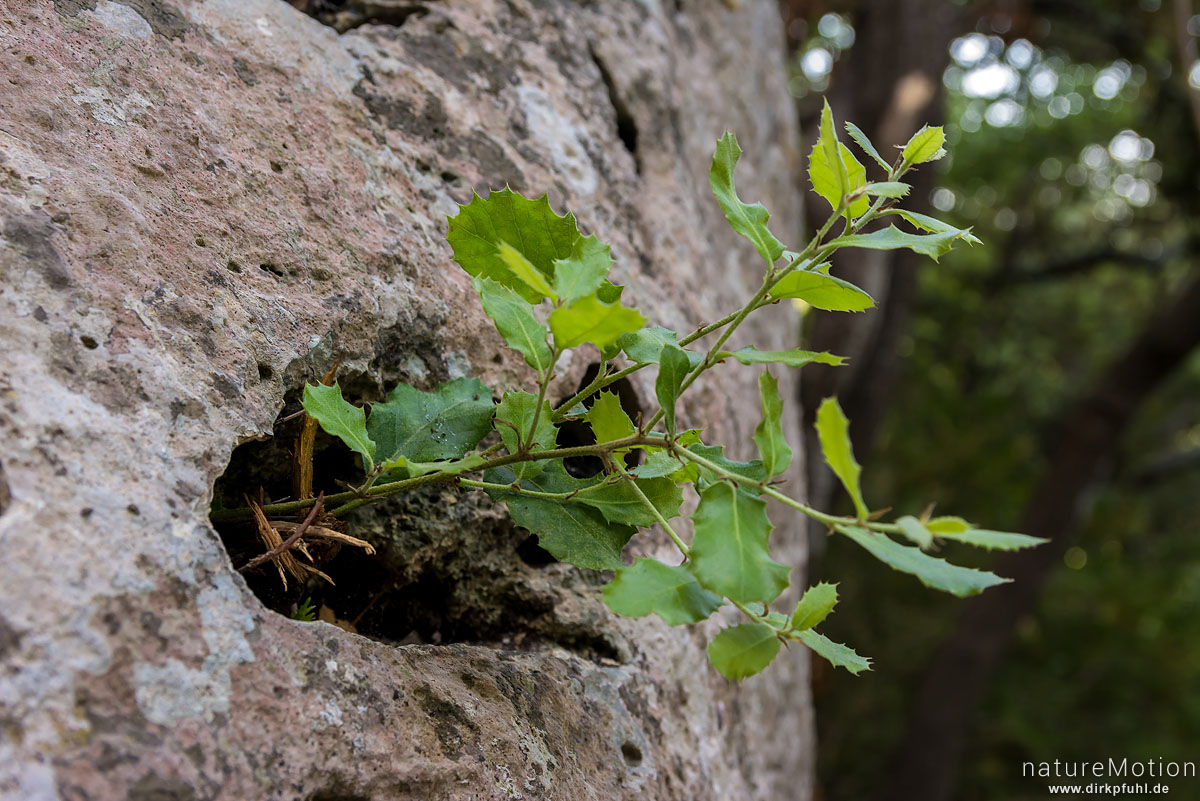 Stechpalme, Ilex aquifolium, Aquifoliaceae, Schössling in Felsspalte, Dschungel im Tal des Aigue Brun, Bonnieux - Provence, Frankreich
