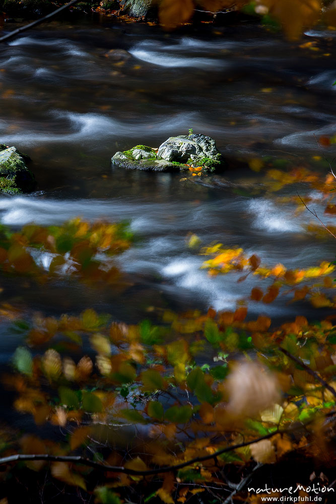 Stein im Bachbett, Herbstlaub, str?mendes Wasser, Bode, Bodetal, Harz, Deutschland