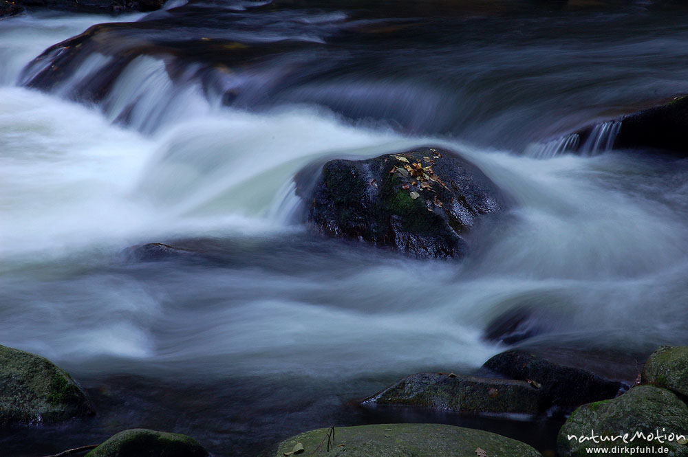 Stein in der Strömung, Bergbach, fließendes Wasser, Steine im Bachbett, Herbstwald, Bodetal Bodetal, Deutschland