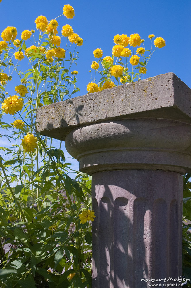 Steinsäule inmitten gelber Blumen Wasserschloss Wülmersen, Deutschland
